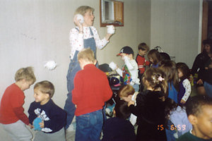 | Movements: | You need approximately 1-2 mesh puffs per participant, and make a tape of lively music with pauses built in about every 10 - 15 seconds. I use my recording of "Let It Snow" – titled "The Freeze" with the pauses already there. A freeze dance will work, and instrumentals are even better. Practice "freezing" before putting on music. First, while sitting on the floor, everyone waves their hands in the air quickly while you say, Hands in the air, hands in the air, hands in the air, FREEZE!" Repeat this. If the children look like they get it, give them the rules. |
