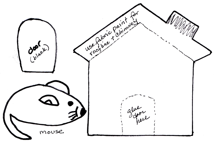 This little game of Hide'n'Seek is simple but so much fun. It also helps with color naming, taking turns, and listening/following directions skills. The tune is easy: "Twinkle, Twinkle Little Star". The felt shapes are easy to make – you can use the patterns below or make up your own. I turn my flannel board to face me (away from the children) when hiding the mouse – there are often "peeking eyes" – and I like to even the playing field! I usually use only 4 houses the first time I share the song, then add one or two each time we sing it after that – up to 8 houses. You can add some fabric paint trim to the house – have some fun!